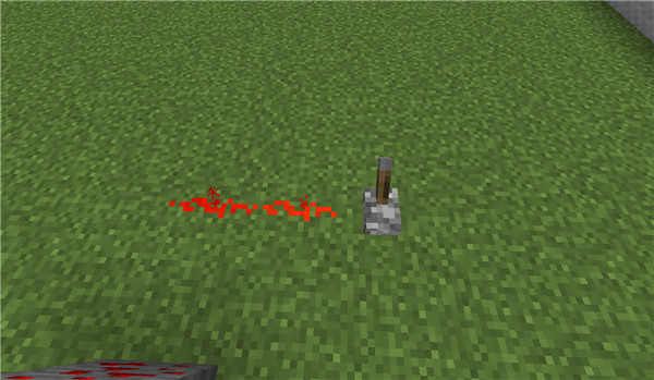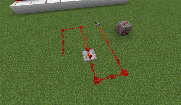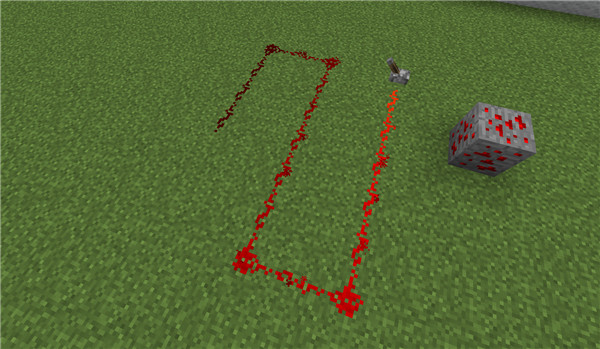 红石线路有两种状态,激活与未激活,处于激活状态下的红石可以激活部分红石机关,而未激活的红石可以通过能发出红石信号的方块进行充能从而激活。如图所示,一个打开的开关可以为红石线路进行充能(激活的标志是变亮)。
