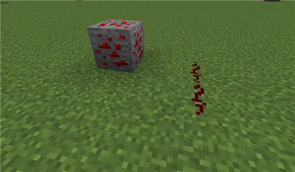 如图所示,左边的矿物是红石矿,开采后可以获得数个红石,红石放置在地上之后就会形成红石线路。要注意的是,红石矿在开采的时候会出现自然发亮现象,不必惊慌,我们开采红石矿的工具至少为铁质的。