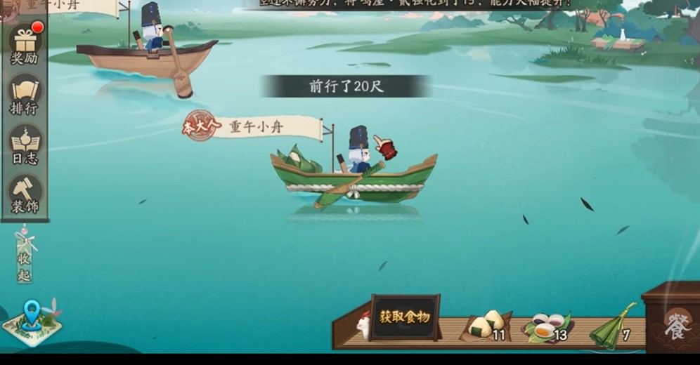 玩家活动更新后越早登录越好,在获取船只后就会不断前行,通过喂食晴明重午美食就可以快速前进一段距离,重午美食可以通过浅夏趣闻、重午斩秽、花合战、美食礼包等方法获取,阴阳师们每天肝一点就可以啦!不仅如此解锁船只的外观可进行船只的装饰,装饰可不仅仅只是为了美观,能够让小船遇到奇遇的概况增加2%,并赠送一个重午美食。