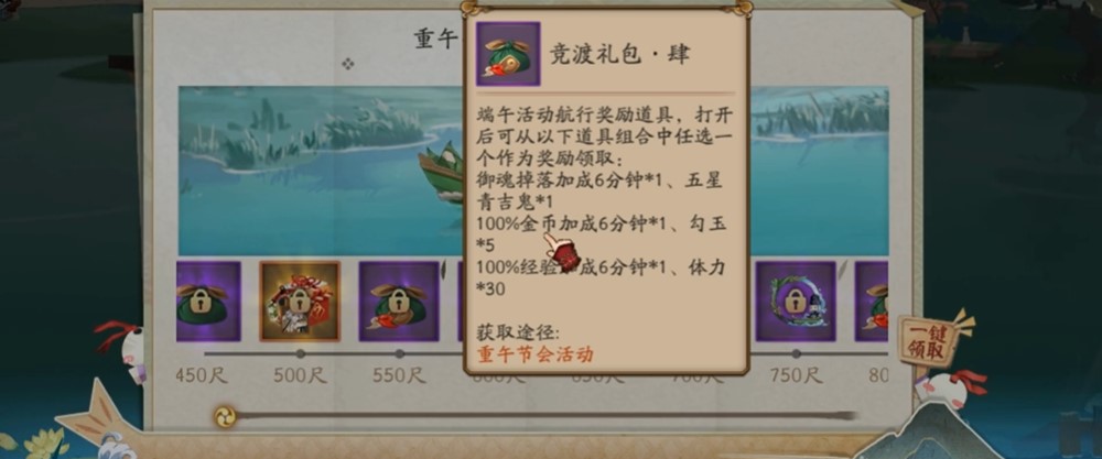 这次重午节会活动的奖励极其丰富,甚至还包括了随机SSR/SP式神兑换券,解锁会根据玩家划船距离慢慢解锁,距离越远奖励越好。
