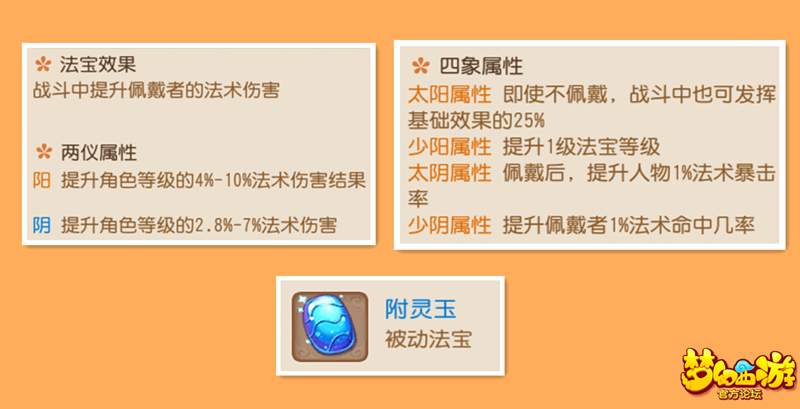 附灵玉:战斗中提升佩戴者的法术伤害。四象属性一般是选择少阳,提升1级法宝等级就相当于直接提升伤害。土豪会选择太阴,提升1%的法术暴击率。