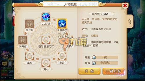 在梦幻西游手游里龙宫的技能与端游相比基本都在。每个门派都有一个特技,只要满100怒气就可以使用,使用后休息一回合。龙宫的特技是魔狼滔天,对所有敌方单位造成法术伤害,充分发挥了龙宫群体攻击的特质,并且伤害一定程度上与目标的损失魔法值有关,目标已损失魔法值越多,伤害就越高,最高更是龙卷雨击的200%,龙卷雨击1级就能秒4,绝对强悍!