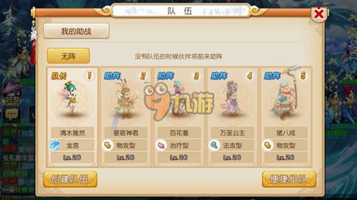 点开界面右上方“队伍”系统,可以看到当前的队伍与助战成员。点击“我的助战”,就可以进入伙伴助战系统,助战成员分为我的好友与三界群雄,这一点与别的玩法并无二致。