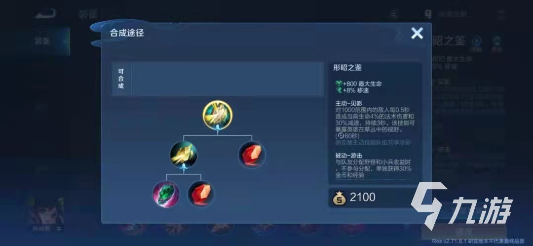 形昭之鉴的属性是增加800点血量,还有8%的移动速度,标准的辅助装备属性,主动技能改为了在使用之后可以对周围一千码范围内的敌人造成持续伤害,和减速效果,并且暴露英雄在草丛中的视野。之前非常强力的显影功能被取消,变成了减速效果,失去了对隐身英雄的克制效果。
