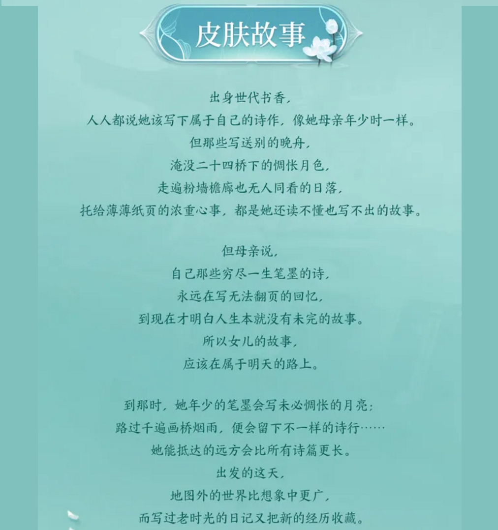 2、该皮肤是中国风的皮肤,以江南水乡为背景,拥有动人的背景故事,西施拿着诗集走过母亲走过的水乡。这几个元素都很温柔,喜欢中国风皮肤的玩家不要错过。
