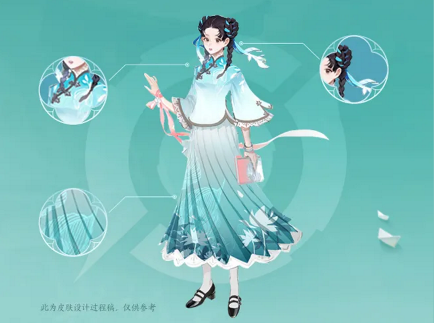 3、在外观设计上,该皮肤把西施塑造成为一个纯真灵动的江南少女,也很符合西施在游戏里的性格和形象。配色上采用少女感的蓝色和粉色,身穿改良式时尚型民国学生服,头扎小辫子,手着粉色丝带,丝带是西施和原皮肤唯一的相同点,锚点很少。