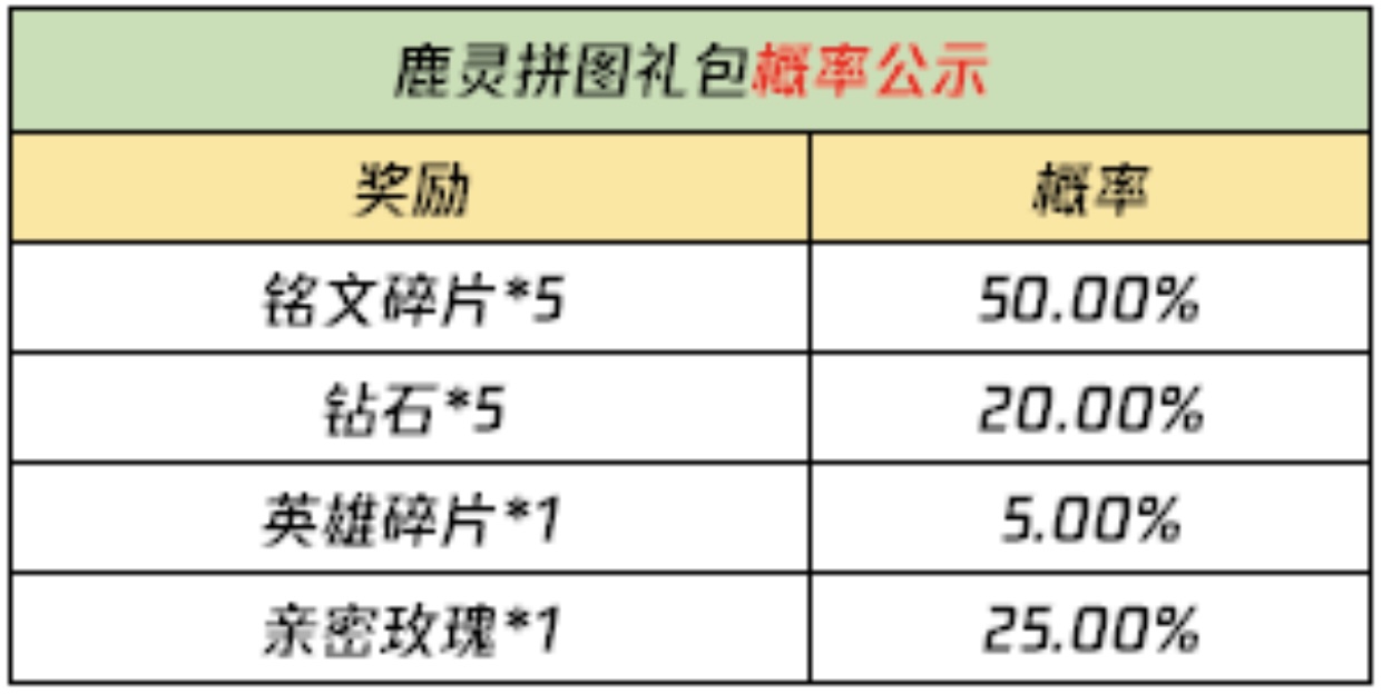 自然拼图活动有哪些奖励:玩家们每次点亮一块拼图,就可以获得鹿灵拼图礼包*1,打开后可以随机获得以下物品之一:钻石*5,铭文碎片*5,英雄碎片*1,亲密玫瑰*1。除此之外,在玩家们点亮所有的拼图之后,还可以领取到自然之灵的回城特效,这款特效设计精美,活动下架后大概率会成为绝版,想要获得的小伙伴们一定要抓紧时间。