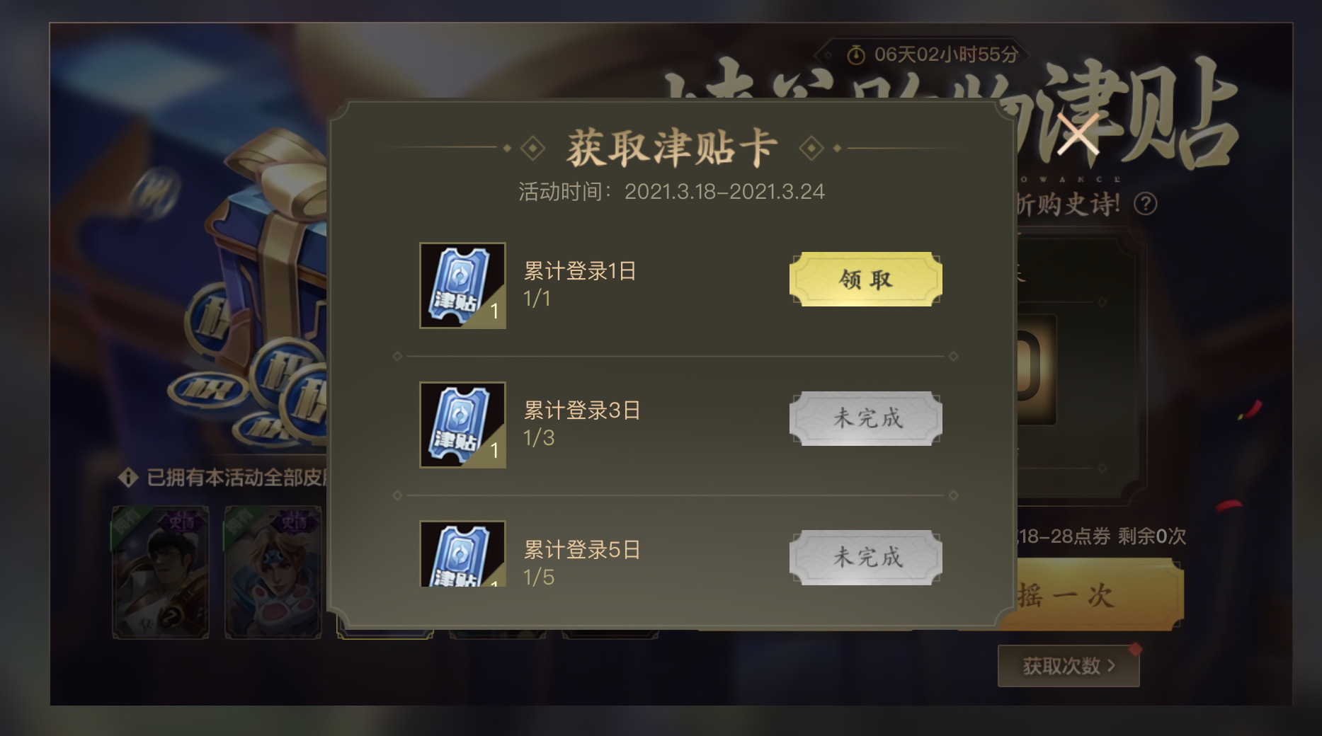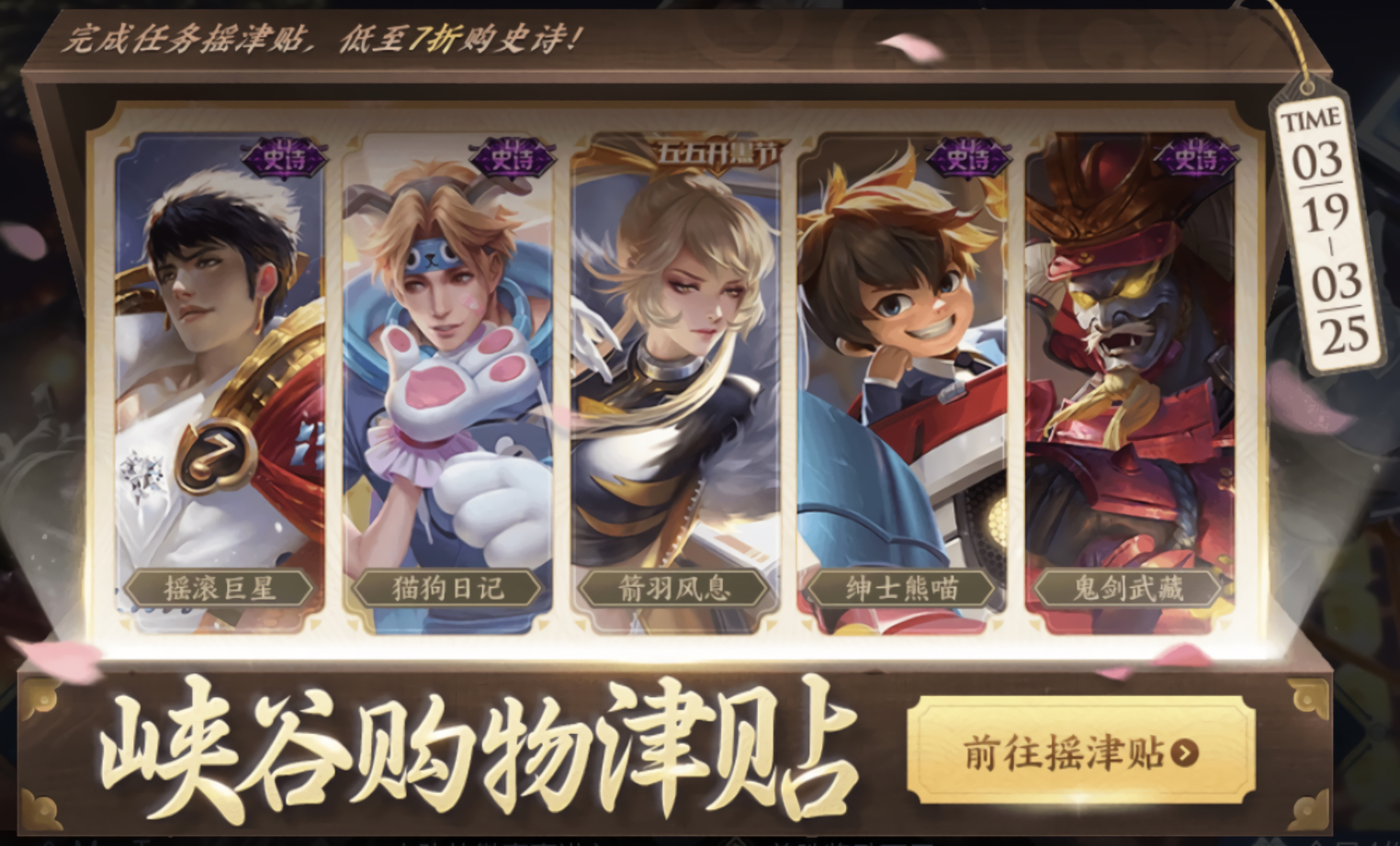 峡谷购物津贴是什么活动:这场于2021年3月19日-2021年3月25日限时开放的购物津贴活动是王者荣耀首次推出的全新购物折扣活动。王者荣耀官方挑选了一些精品史诗皮肤参与购物津贴活动,召唤师们只需要完成一系列官方给出的任务就可以成功领取到购物津贴,用来买活动皮肤。购物津贴的具体获得情况是根据玩家们自己完成任务的数量和抽奖运气来决定的,但最高不会超过267点券。折合一下,我们可以算出玩家最低能以621点券的价格买到一款史诗级别的皮肤,甚至低于首周710点券的价格,可以说是非常划算了,小编建议大家一定要积极参与本次活动,不要错过优惠。