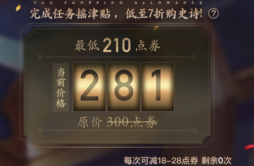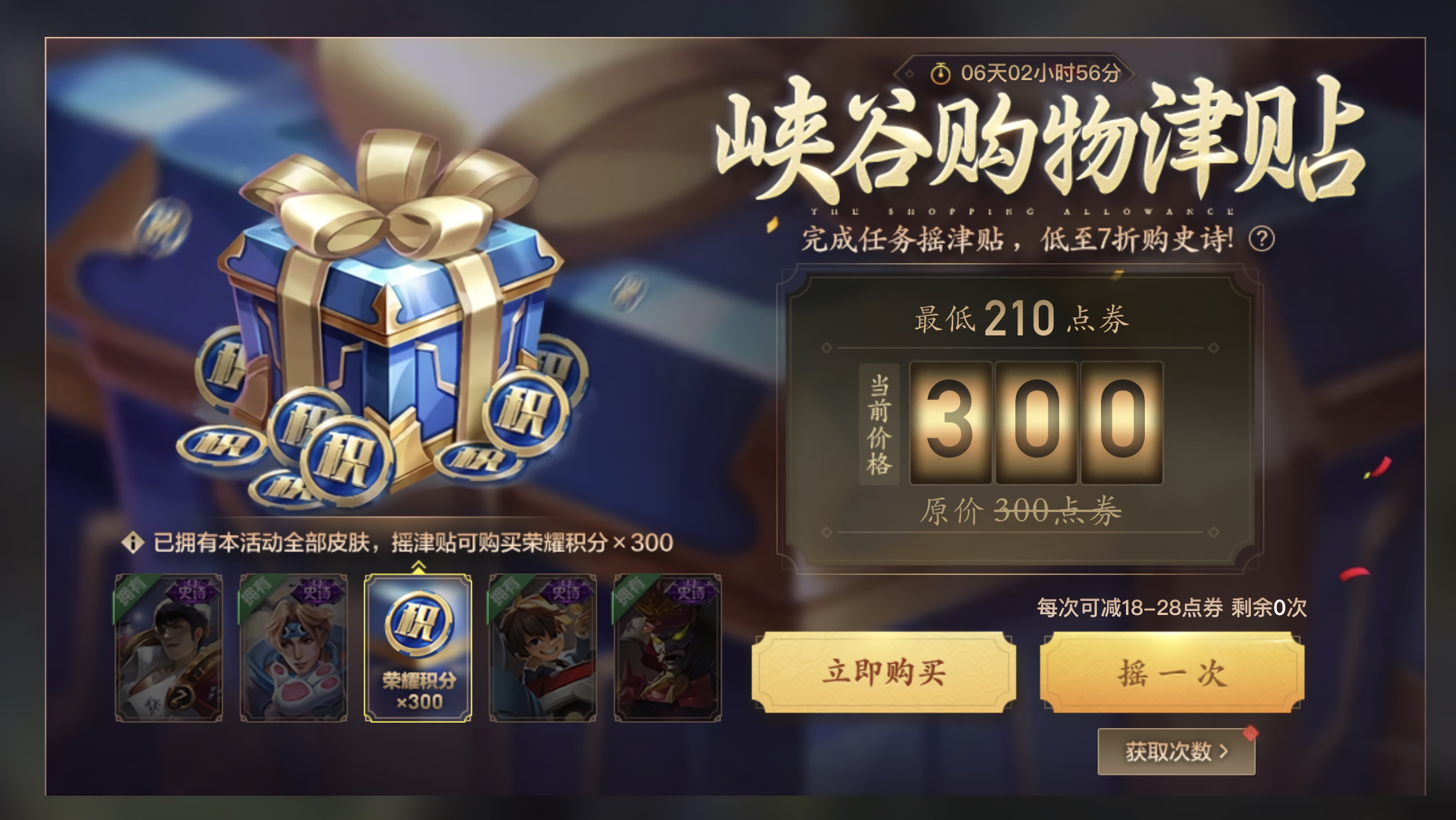 怎么样获得峡谷购物津贴:玩家们通过完成官方任务就可以获得摇一摇次数,每摇一次都会概率获得一定数量的购物津贴,在28-48点券范围内浮动。同时玩家们的津贴累积到最高值时,就不可以再通过摇一摇摇出津贴。小编建议大家在摇满之后立刻前去购买自己心仪的皮肤。