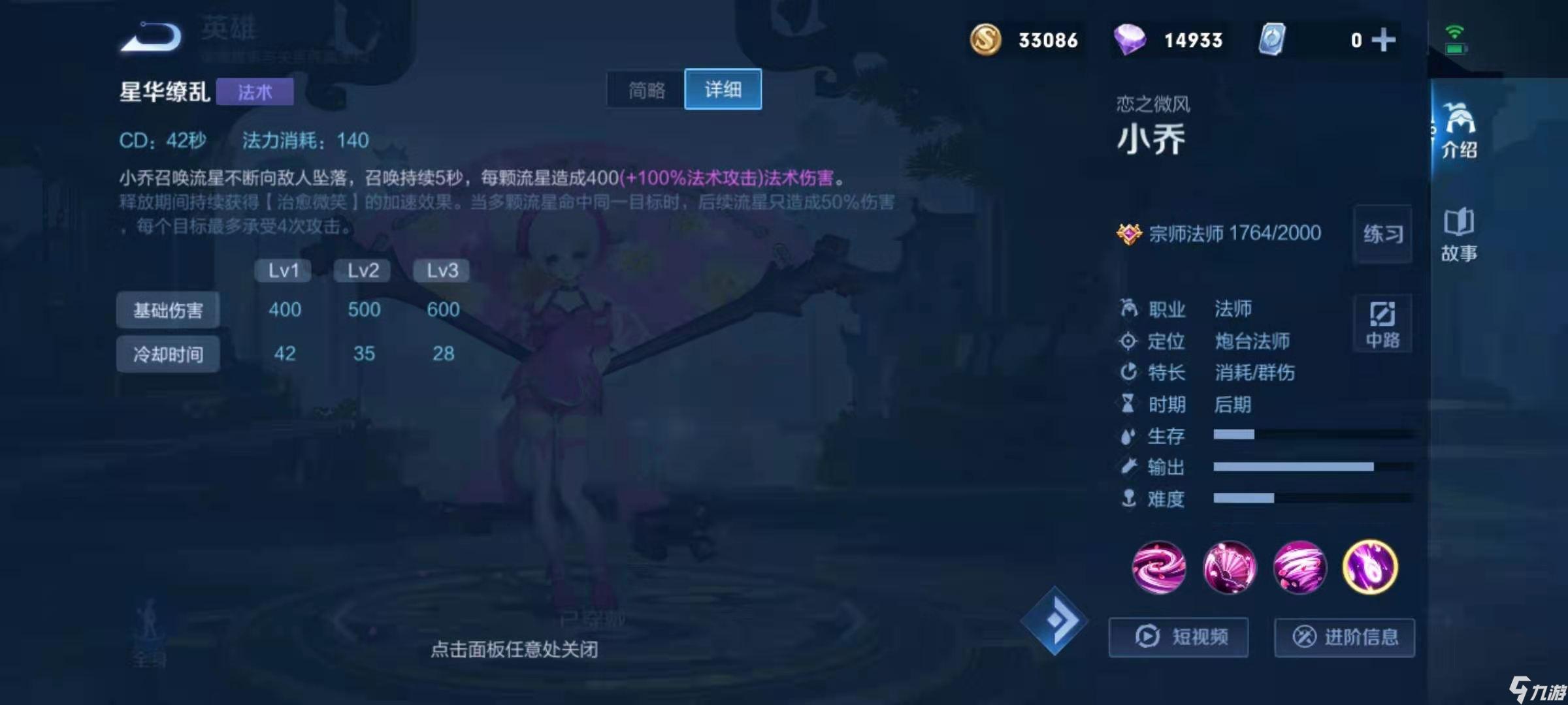 第三个特点是容错率高,很多英雄的大招冷却时间长,而且很容易空大,一旦空大对战局影响很大,但是小乔的大招是自动寻找目标,基本不会出现空大的情况。而且CD短,只有42秒,一场战斗可以开启两次,容错率很高。