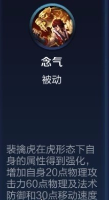 虎形态被动计算方式:增加自身20点物理攻击+(英雄等级-1)*3/+60(英雄等级-1)*4 点物理,法术防御+30点固定移动速度