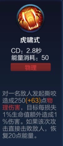 虎啸式伤害计算方式:250基础伤害+50*(技能等级-1)+115%额外物理攻击力