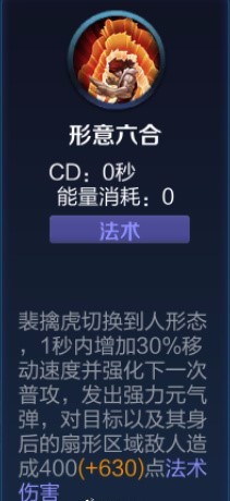 形意六合伤害计算:造成基础伤害400+100%的物理攻击力加成 的法术伤害,目标背后的扇形目标同样会受到伤害。