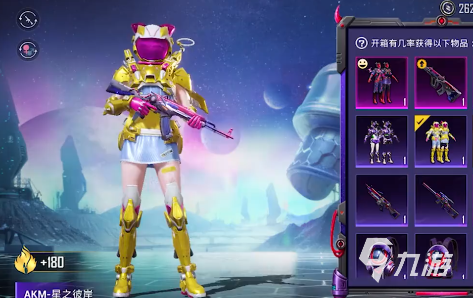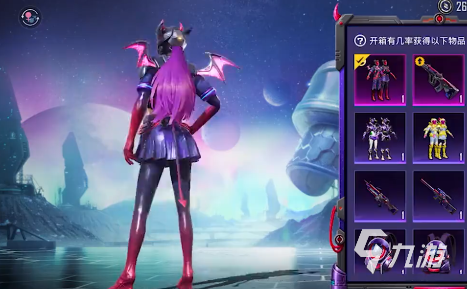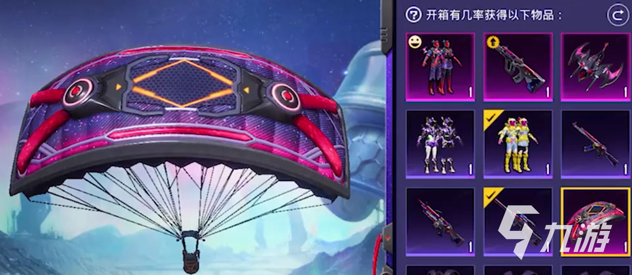 除了主要的套装外,还有一些配件。例如降落伞就是红蓝色调的。上面是一些黑夜星空的酷炫元素。星星点点的元素特别浪漫。另外还有一些红紫色的武器以及背包,整体的质量都很不错。