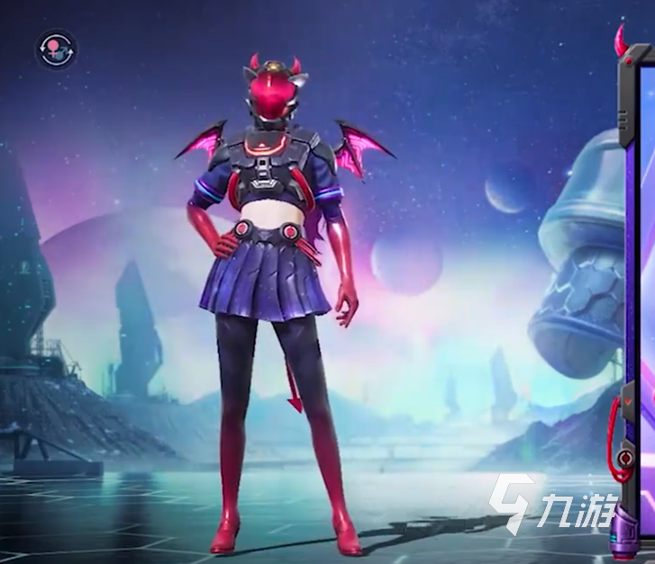 首先军需系列的皮肤有两套。第一套叫做星之彼岸,是偏暗黑性感风的。带上去之后你就可以带着一个恶魔头盔,然后背上伸出一对恶魔羽翼。她还穿着一袭超短裙还有蓝红渐变的袜子,看上去十分有魅惑力。背后的话,还会伸出一条尾巴。还有着长长的紫色头发。御姐风的气息十分浓厚。至于胸前便是防弹衣,战斗气息十足。