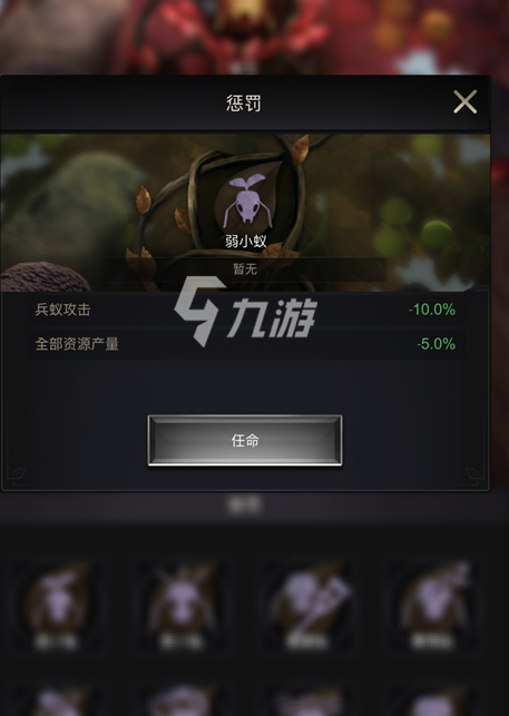 弱小蚁——部队攻击-10%,全部资源产量-5%,蚂蚁整体实力消减。